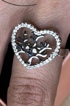 Toptan Gümüş Renk Zirkon Taşlı Kalpli Hayat Ağacı Model Çelik Yüzük Ayarlanabilir Çelik Yüzük – 3099