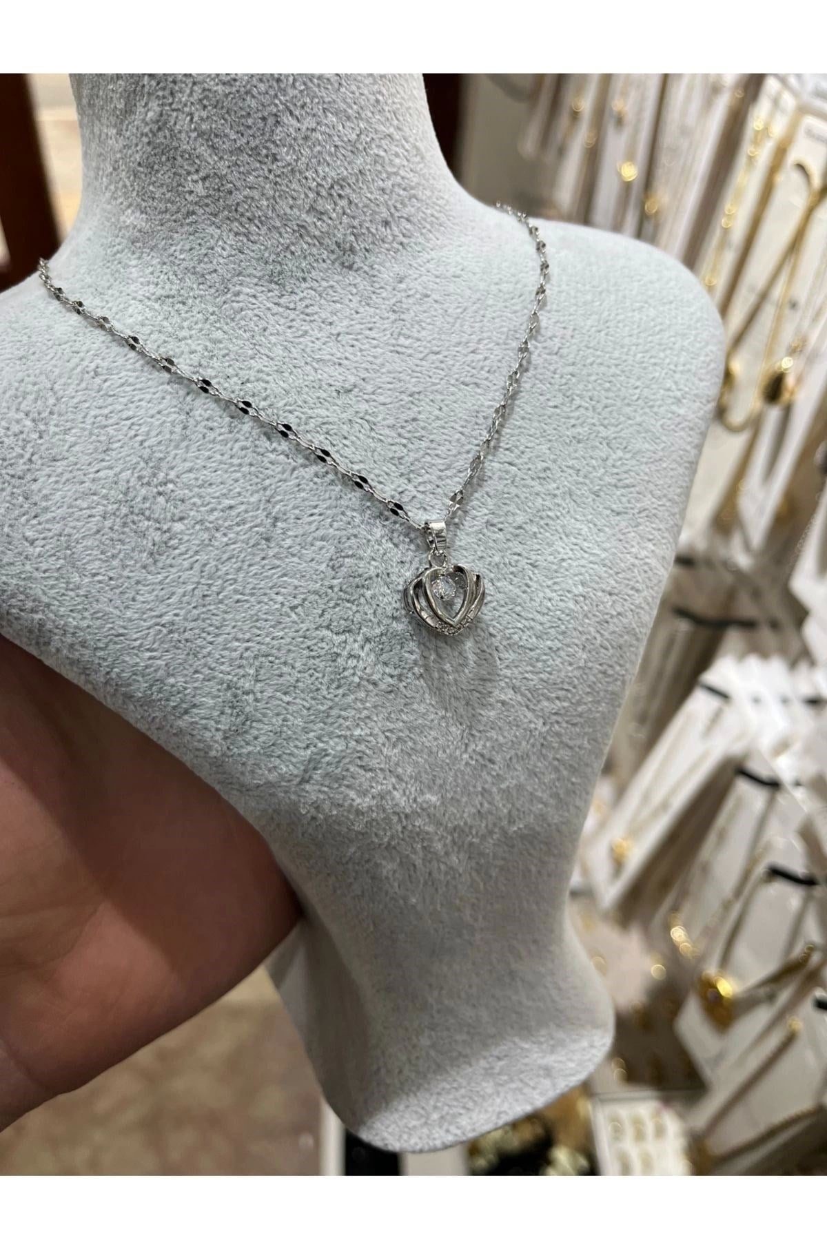 Toptan Gümüş Renk Singapur Zincirde Kalp Tektaş Detaylı Vip Solmaz Kararmaz Çelik Kolye – 3046
