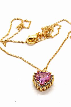Toptan Altın Renk Zirkon Pembe Taşlı Kalp Kolye – 962