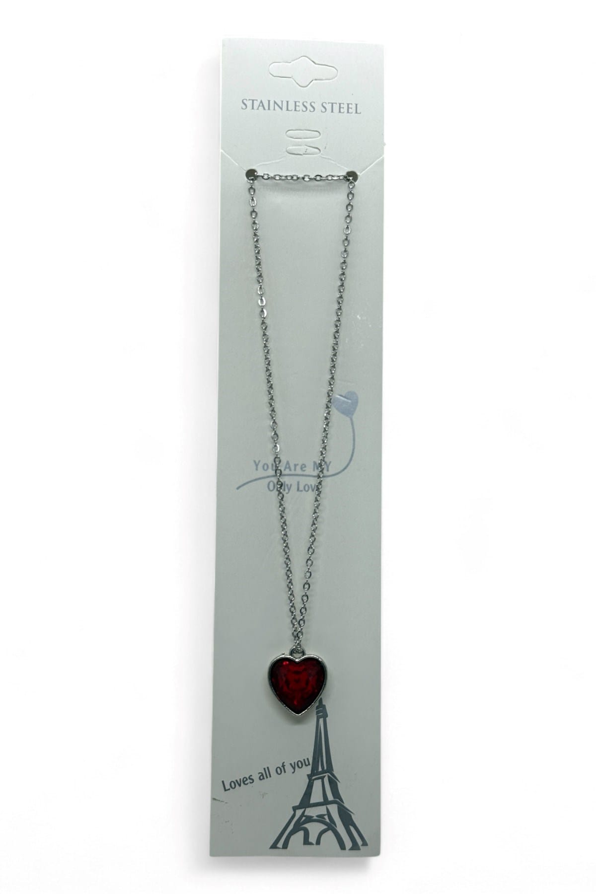 Toptan Gümüş Renk Bordo Kalp Model Sf Zincir Çelik Kolye -  3785