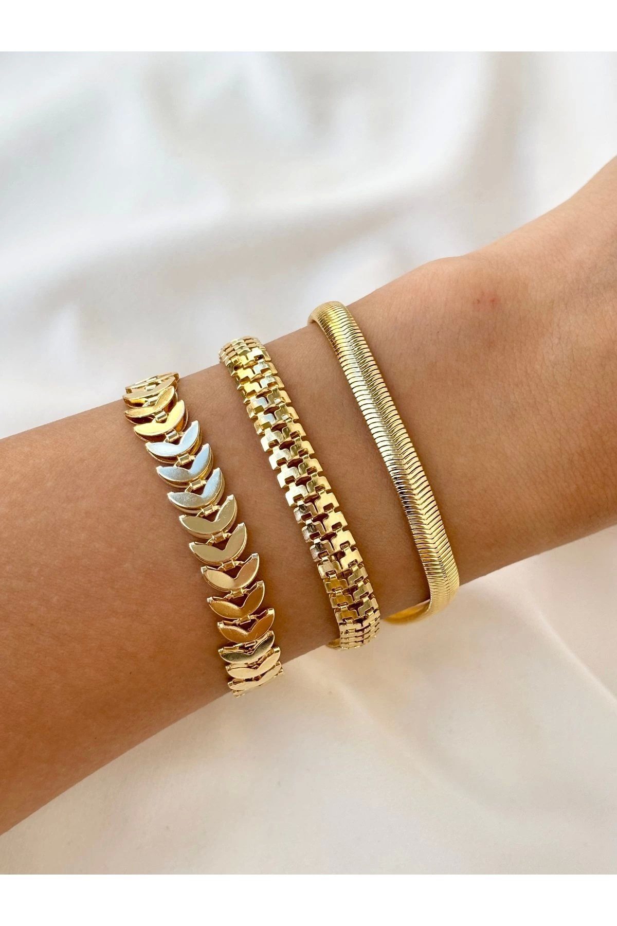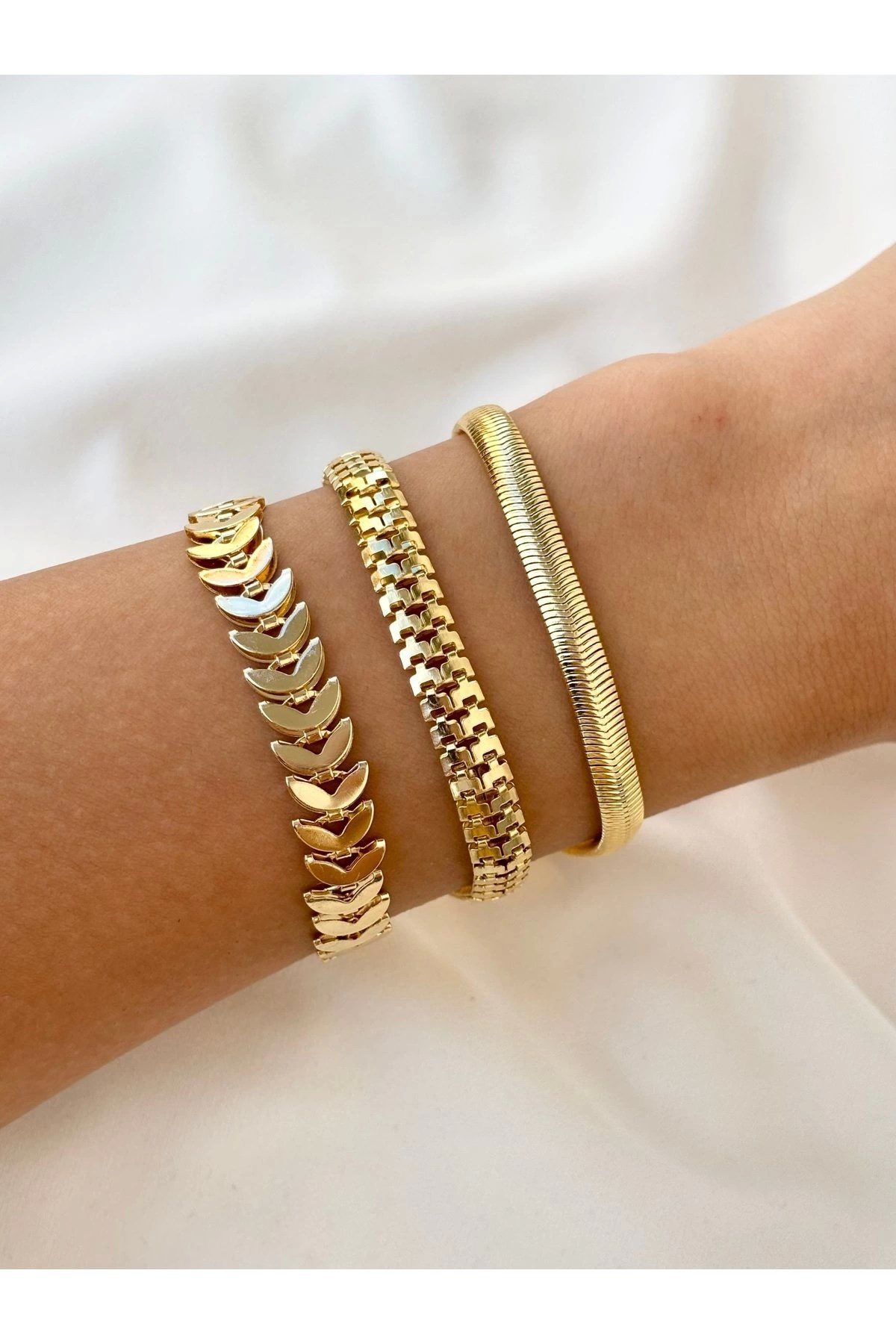Toptan Altın Renk Kadın 3’lü Kombin Bileklik Seti Kılçık İtalyan Tırtıl Kombin Bileklik Seti -  3843