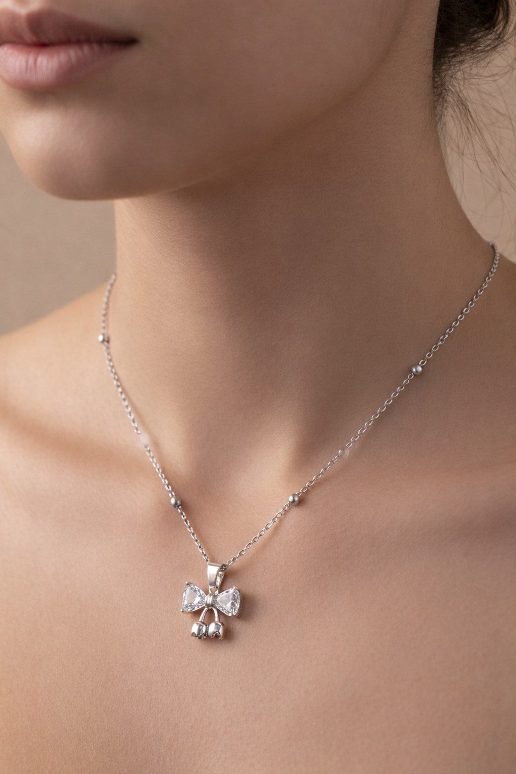 Toptan Gümüş Renk Kalp Fiyonk Model Top Zincir Çelik Kolye- 3854