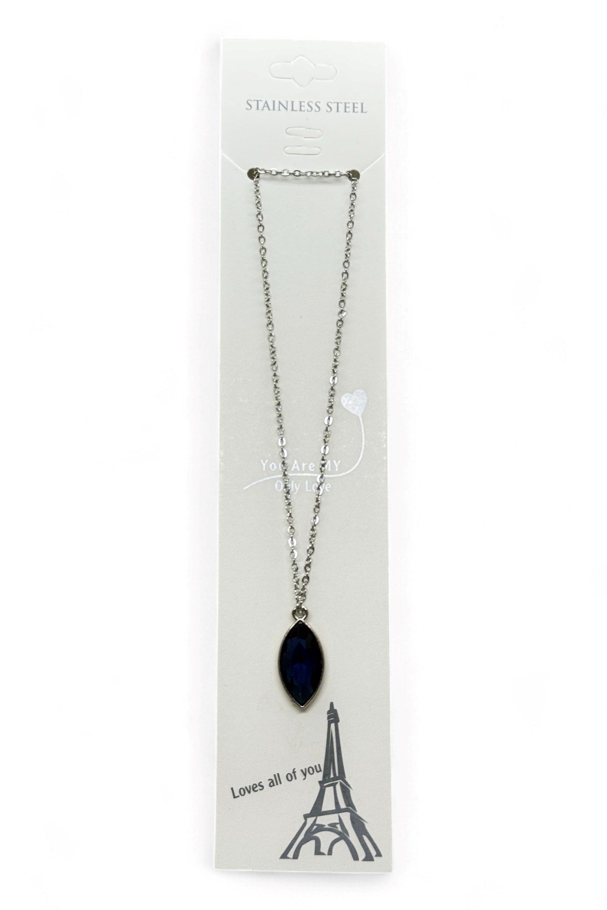Toptan Gümüş Renk Lacivert Mekik Taşlı Model Sf Zincir Çelik Kolye – 3804